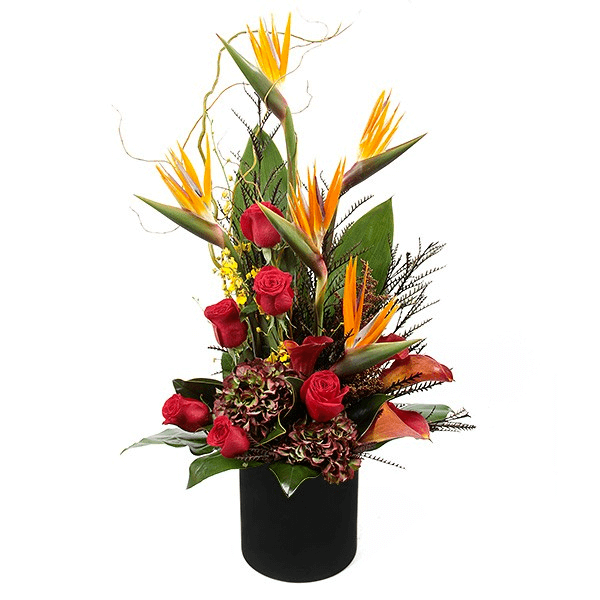 Rosas vermelhas, lilás laranja e hortênsias antigas (verdes e roxas) fazem uma exibição ousada e dramática de flores exuberantes. Arranjado em um vaso cerâmico preto. Este arranjo é certo para impressionar quem recebe.