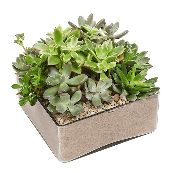 Um oásis de suculentas sortidas em um recipiente quadrado de vidro com areia dourada. Inspirado pelas dunas nunca cessantes do deserto do Saara que criam uma paisagem de areia que só é interrompida pelas lindas e resilientes plantas do deserto. Um presente minimalista, simbólico e simbólico. Excelente decoração para casa ou escritório. Envie flores e desejos amorosos pela nossa loja virtual.