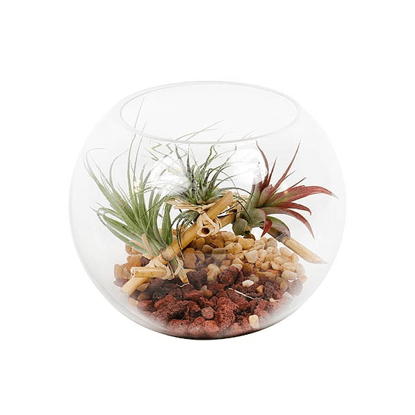 Um conjunto de três (3) Plantas do Ar em um aquecedor de vidro transparente, arrumados com varas de bambu e rocha de lava decorativa. As Plantas do Ar estão intimamente relacionadas com suculentas, tornando seus requisitos de baixa manutenção uma escolha de planta ideal para casa ou escritório. Note: As Plantas do Ar contidas neste arranjo podem variar dependendo do que está atualmente disponível, mas combinarão em estilo e valor.