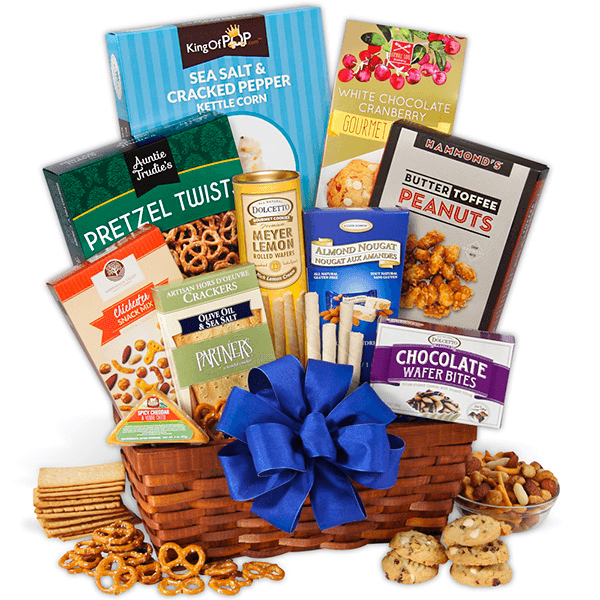 Bem, para começar, está cheio de produtos gourmet que não são apenas deliciosos, mas também premiados! Esta bela recompensa de restaurantes gourmet inclui lanches como toffee de amendoim amanteigado, biscoitos, queijos e pretzels clássicos, que estão dispostos em uma das nossas cestas elegantes, criando um lindo presente que é perfeito para qualquer ocasião.